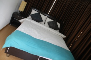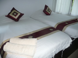Upstairs, the master bedroom has a master suite with a lavish en-suite bathroom which has a double jacuzzi bathtub and walk-in shower, access via a walk-in wardrobe. The third bedroom, a double, is also upstairs. All bedrooms have aircon.