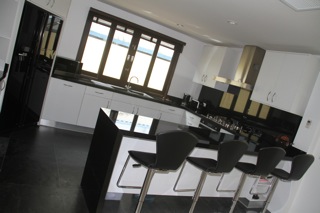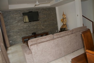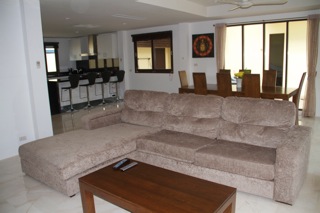 Furnished throughout with local stone and granite, the villa has a cool and sophisticated air throughout. Entering the villa, you are immediately greeted by spectacular statue. The spacious living area has a large L-shaped sofa, facing a feature stone wall, with flat-screen TV and large dining table. Behind this is a modern kitchen finished in granite with oven, hob, microwave and washing machine.