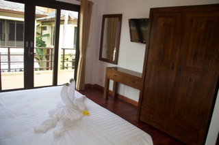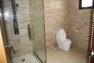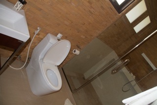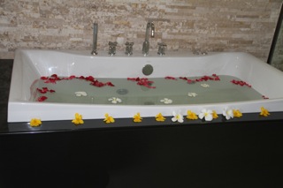 Upstairs there are three double bedrooms, all beautifully furnished and decorated with traditional teak wood furniture, in clean, cool shades, with colour acents. The master bedroom has an gorgeous en-suite stone bathroom and bedroom two a private balcony to the front of the property. There is a further bathroom on the first floor, again in stone, with a jacuzzi bathtub and walk-in shower.